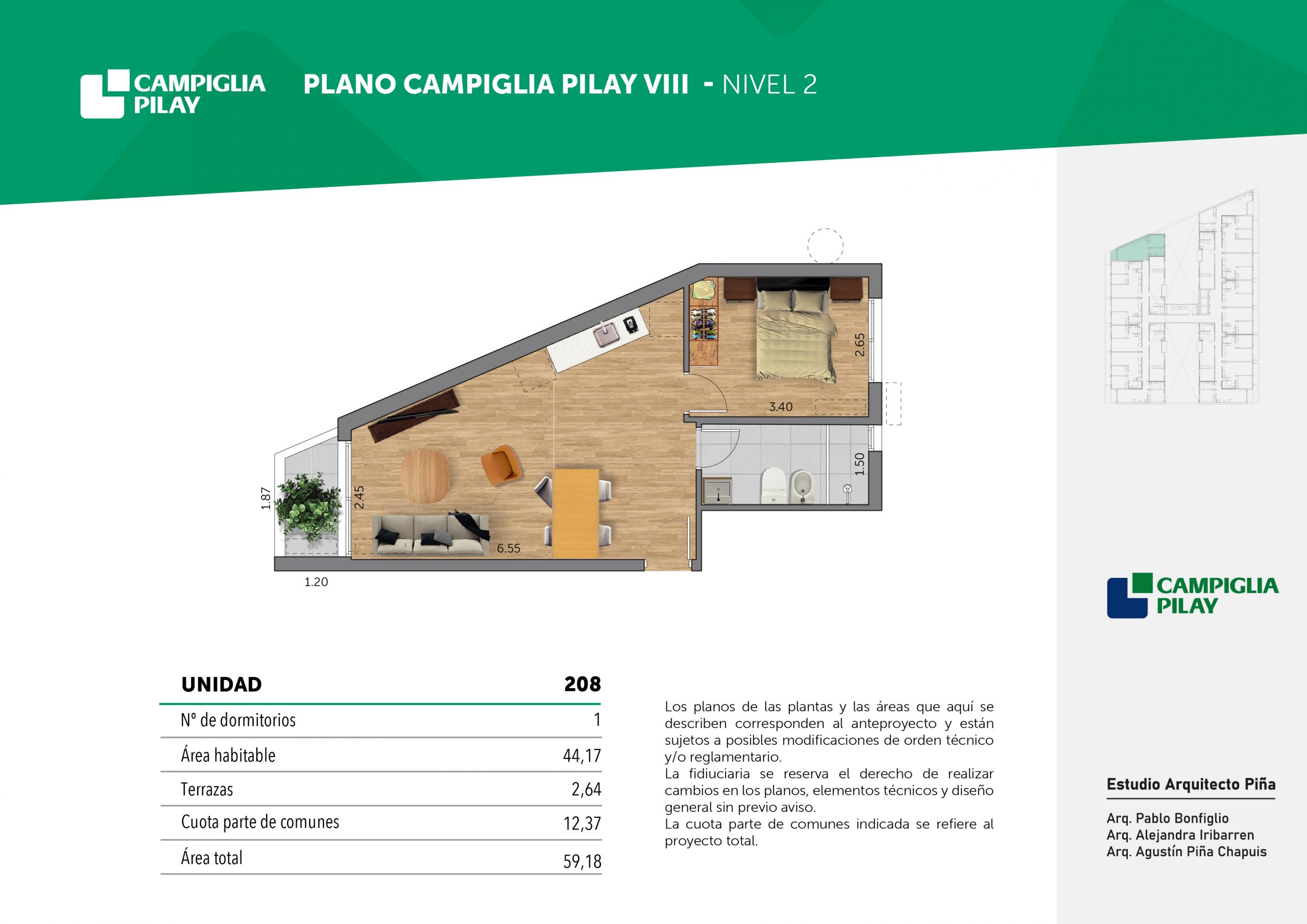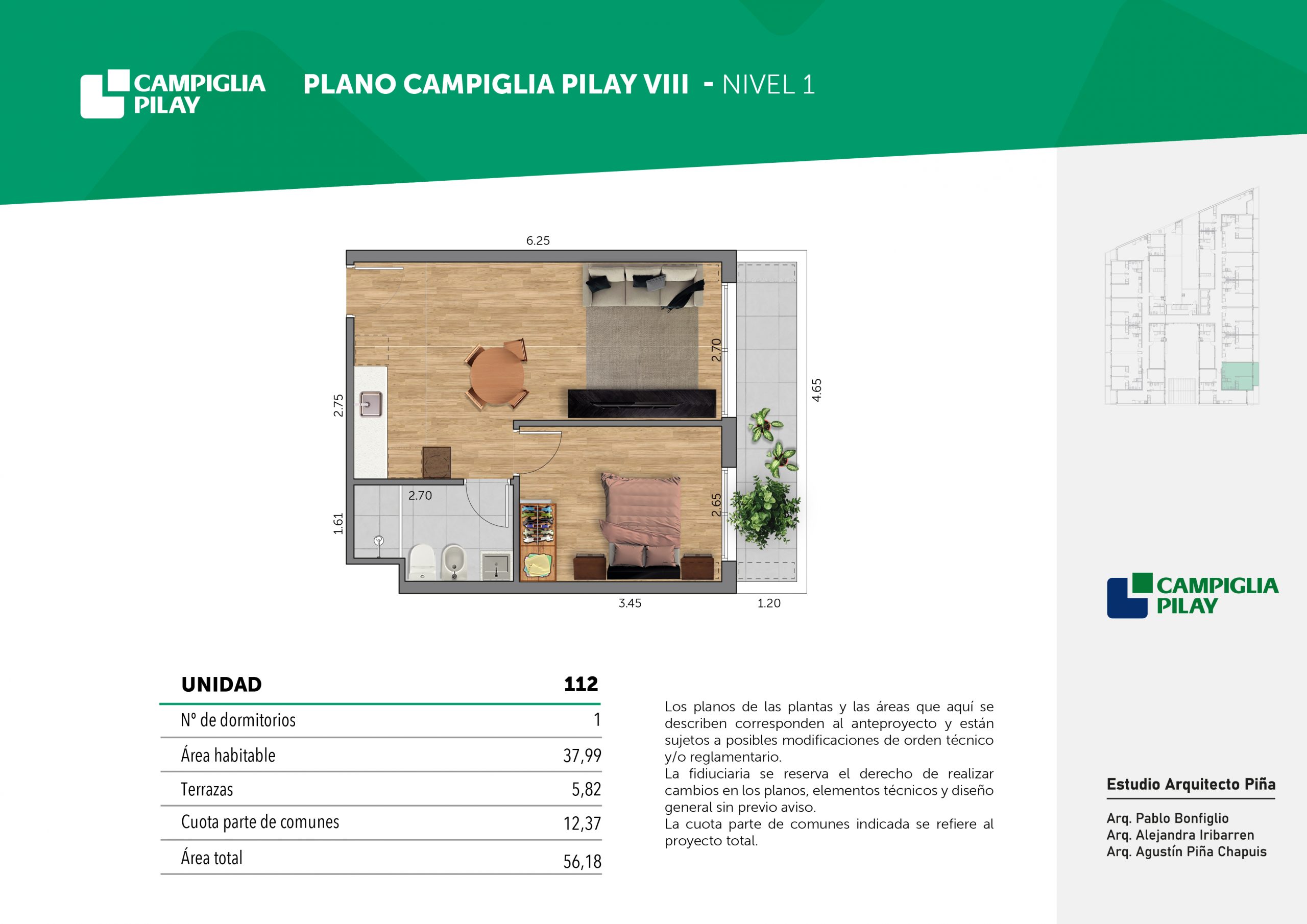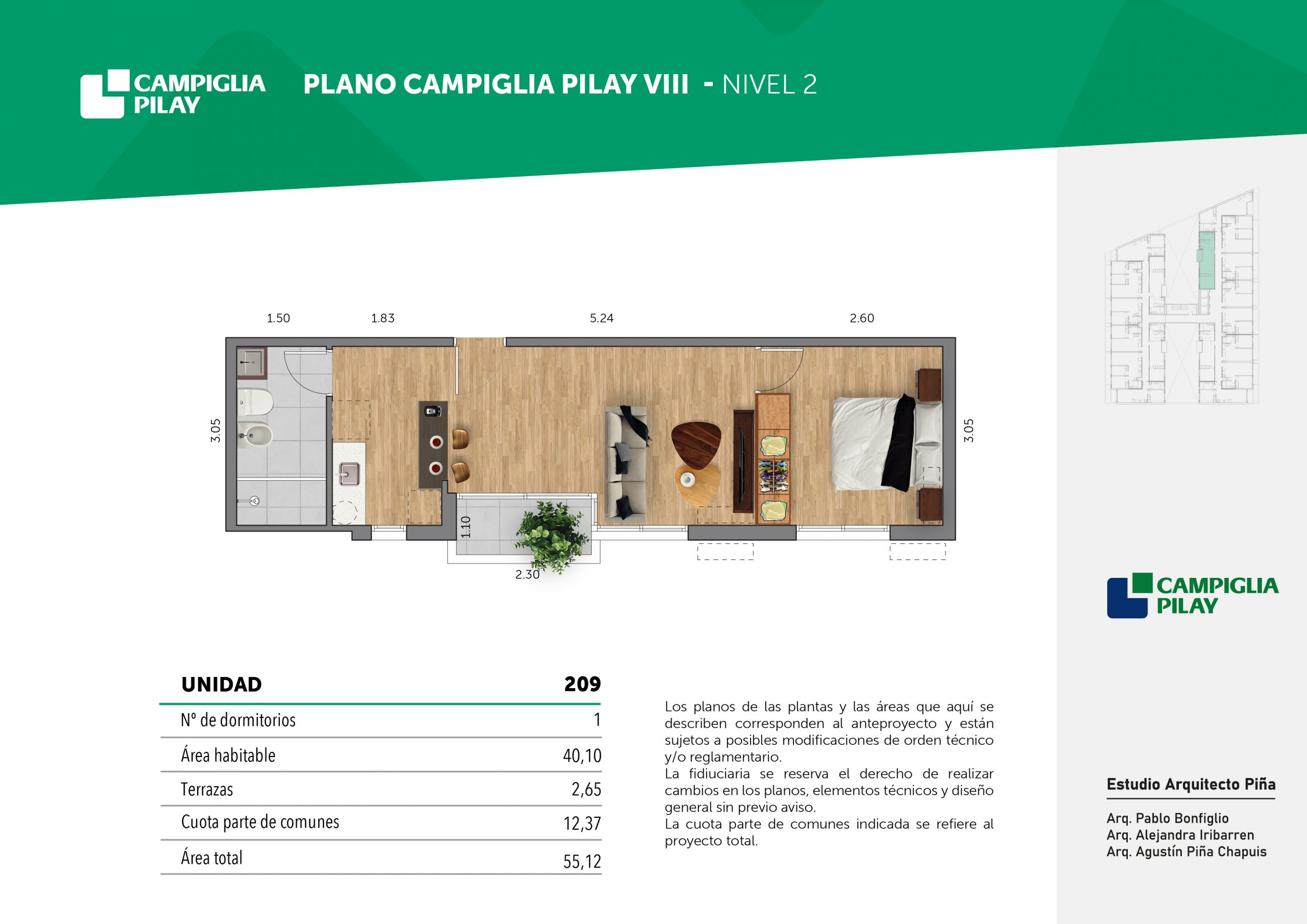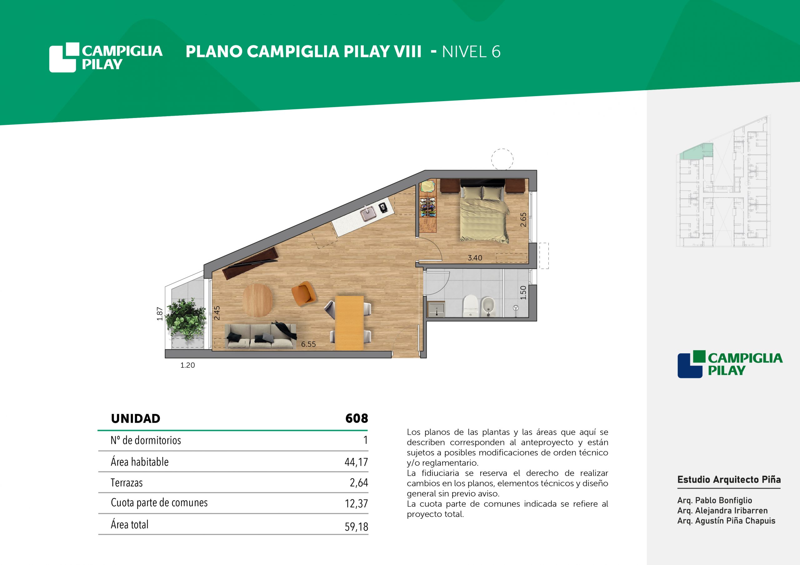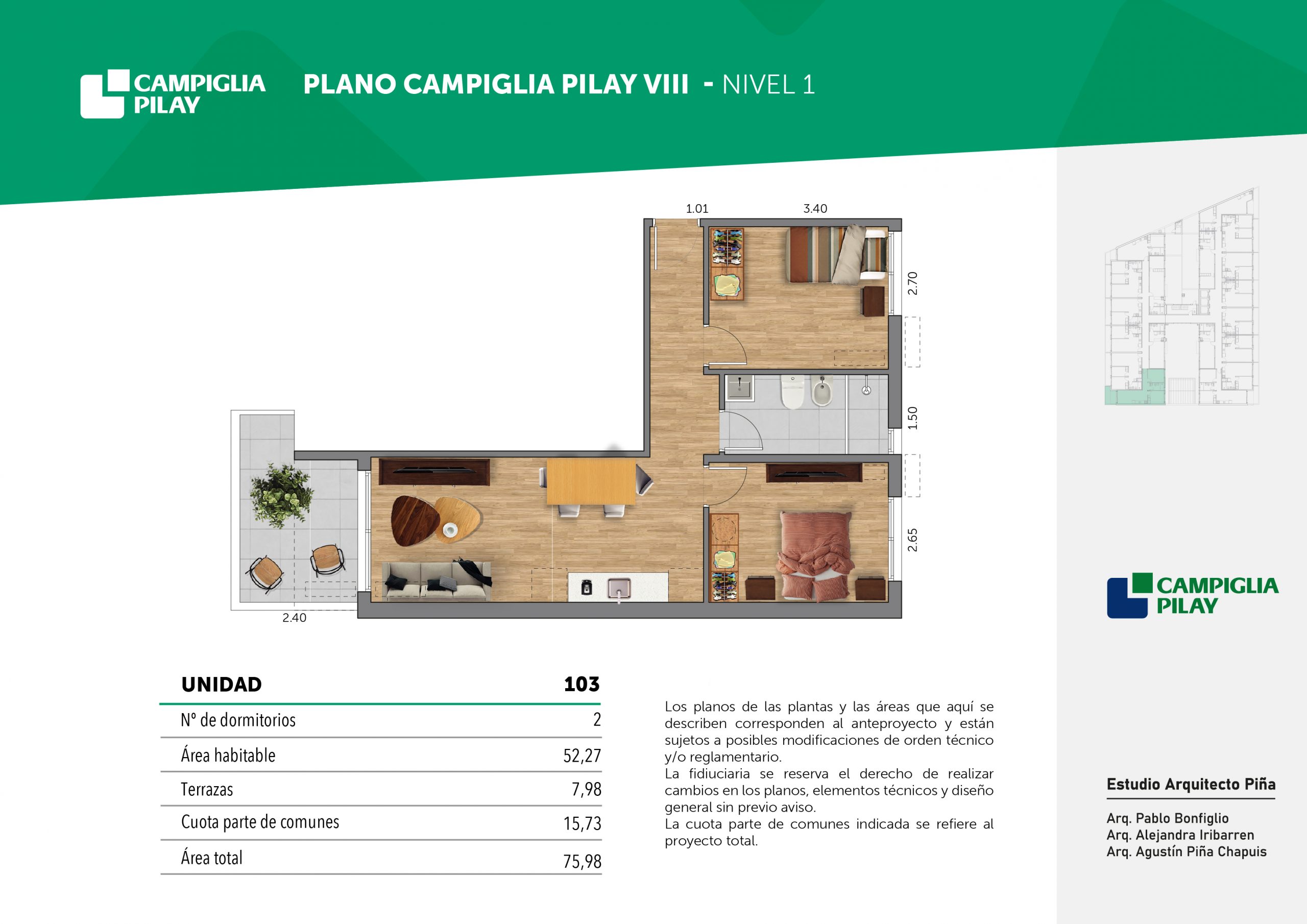 Cantidad de unidades en total: 195 unidades (159 unidades de 1 dormitorio y 46 unidades de 34 dormitorios) + 118 cocheras en total (aprox).