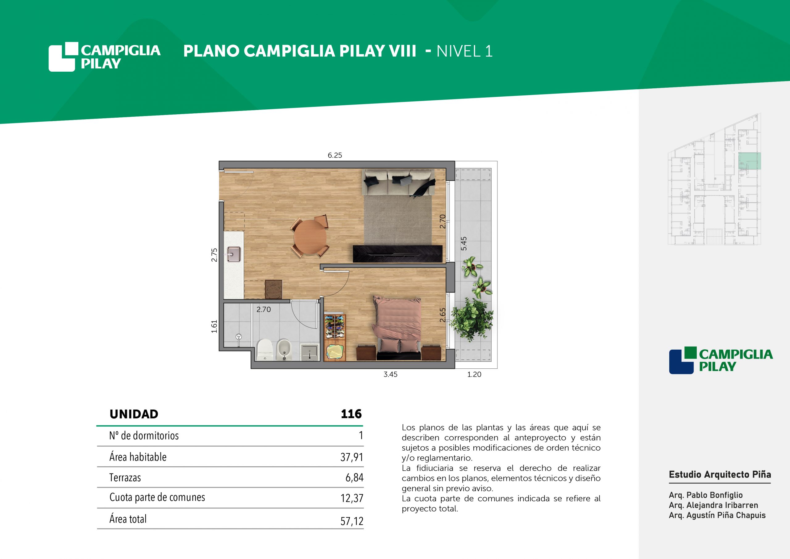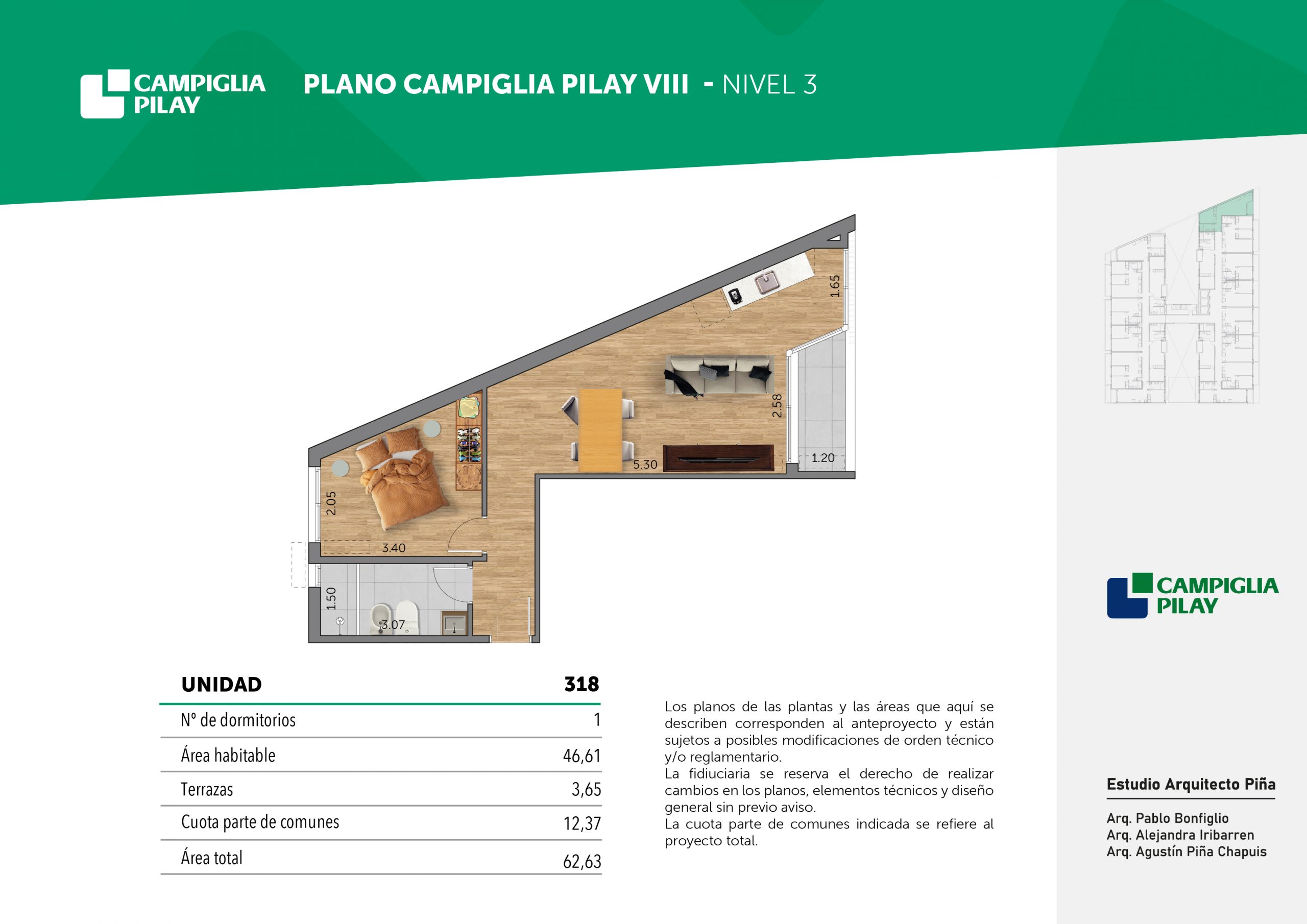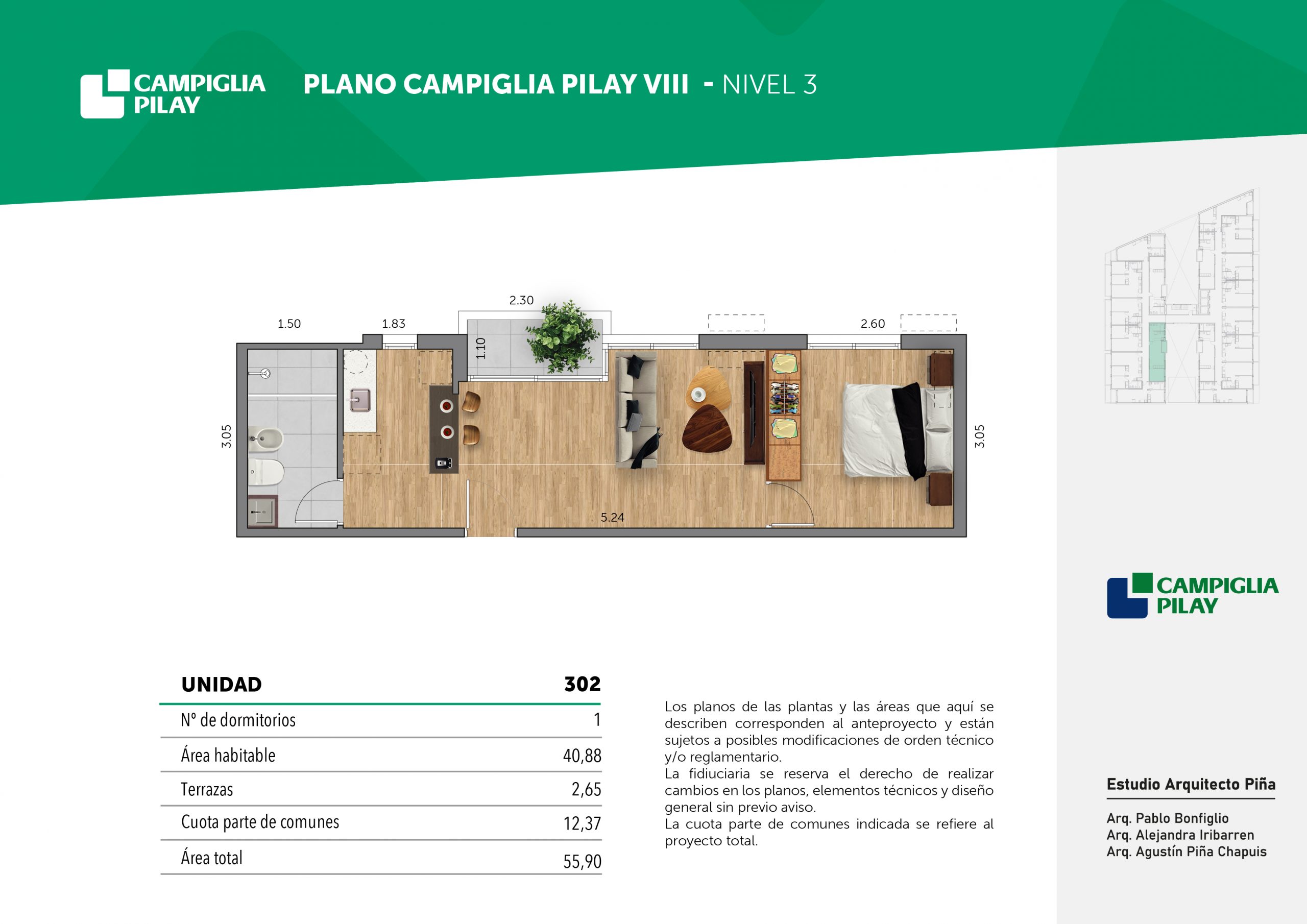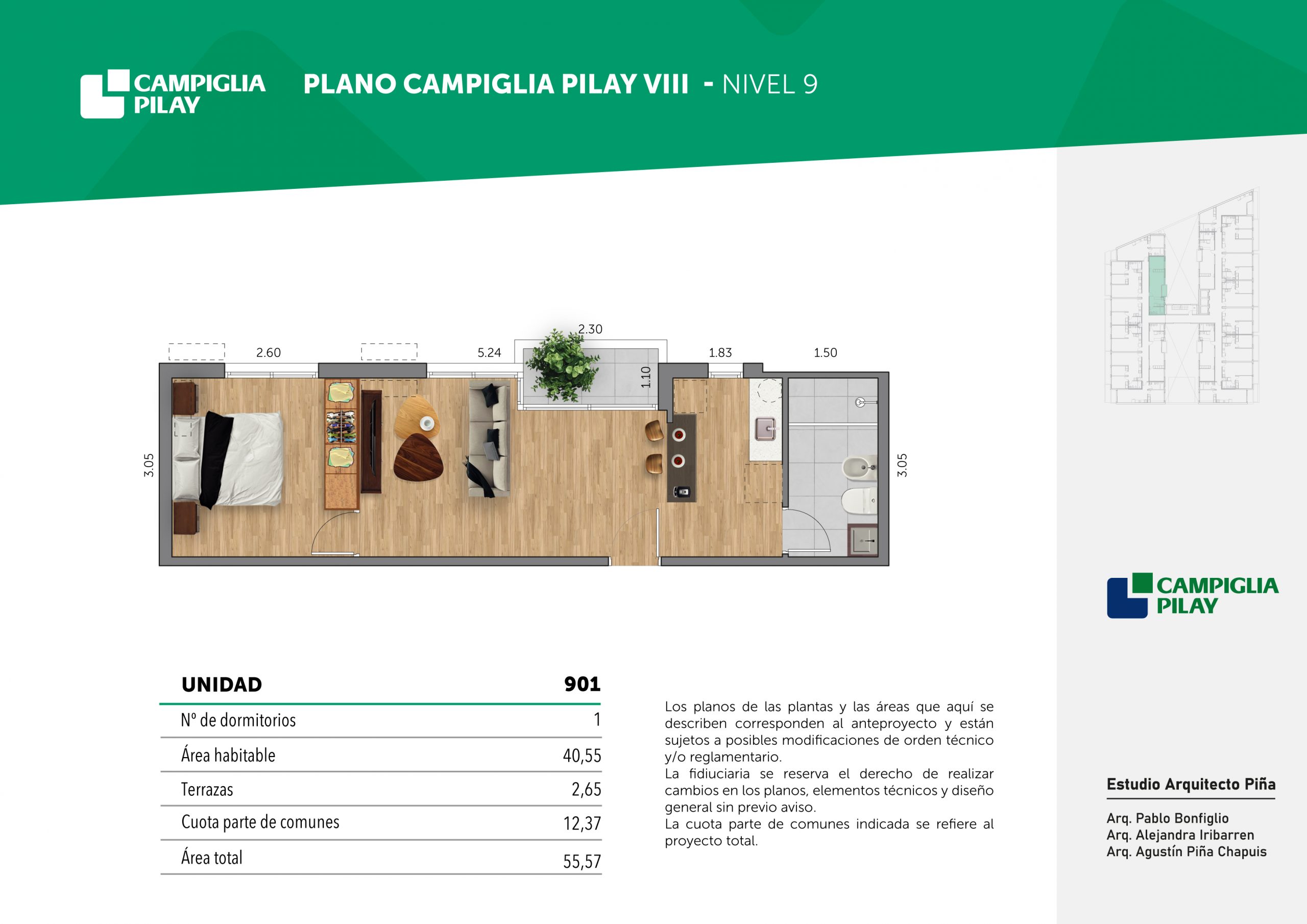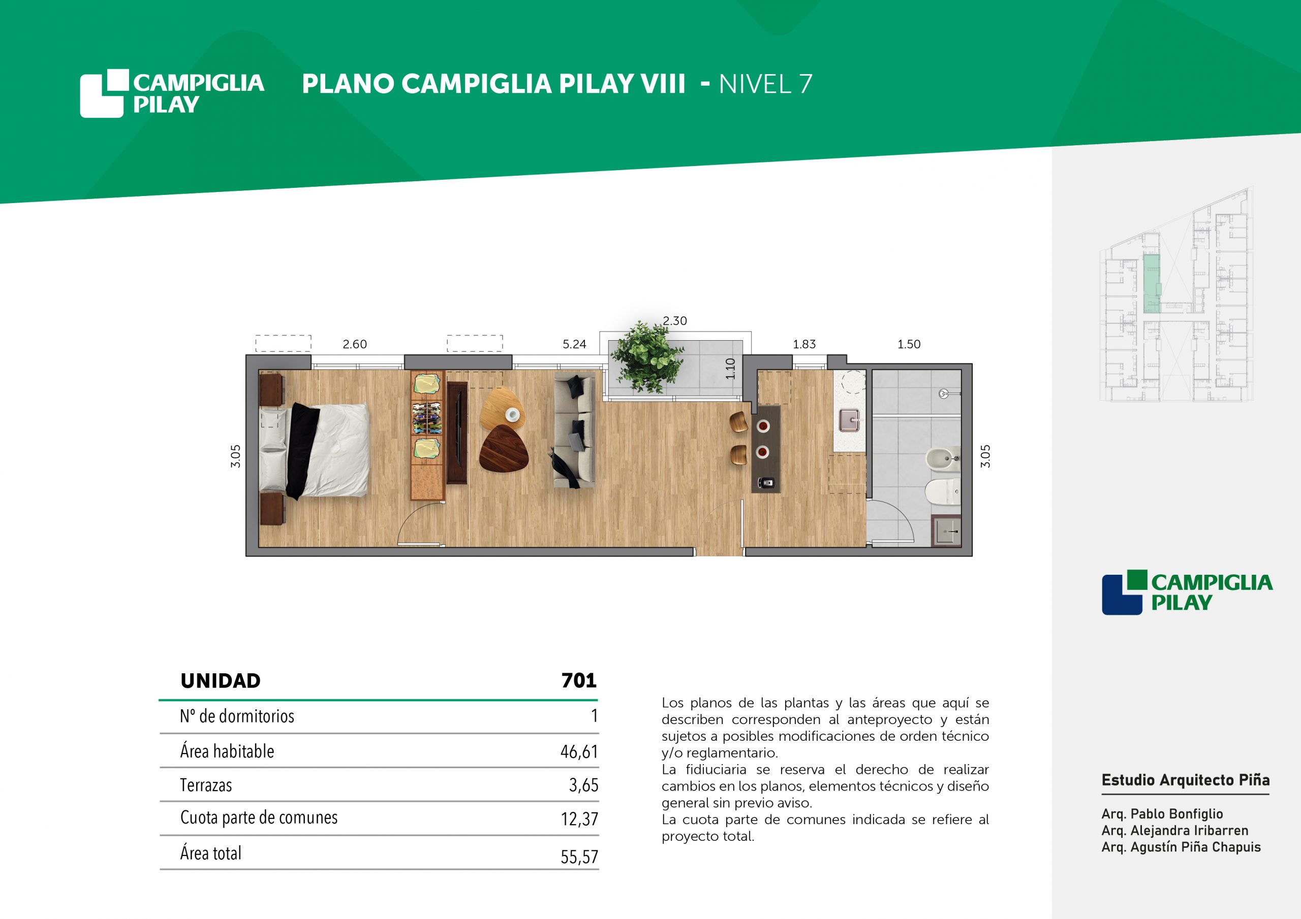 Cantidad de unidades en total: 195 unidades (159 unidades de 1 dormitorio y 46 unidades de 34 dormitorios) + 118 cocheras en total (aprox).