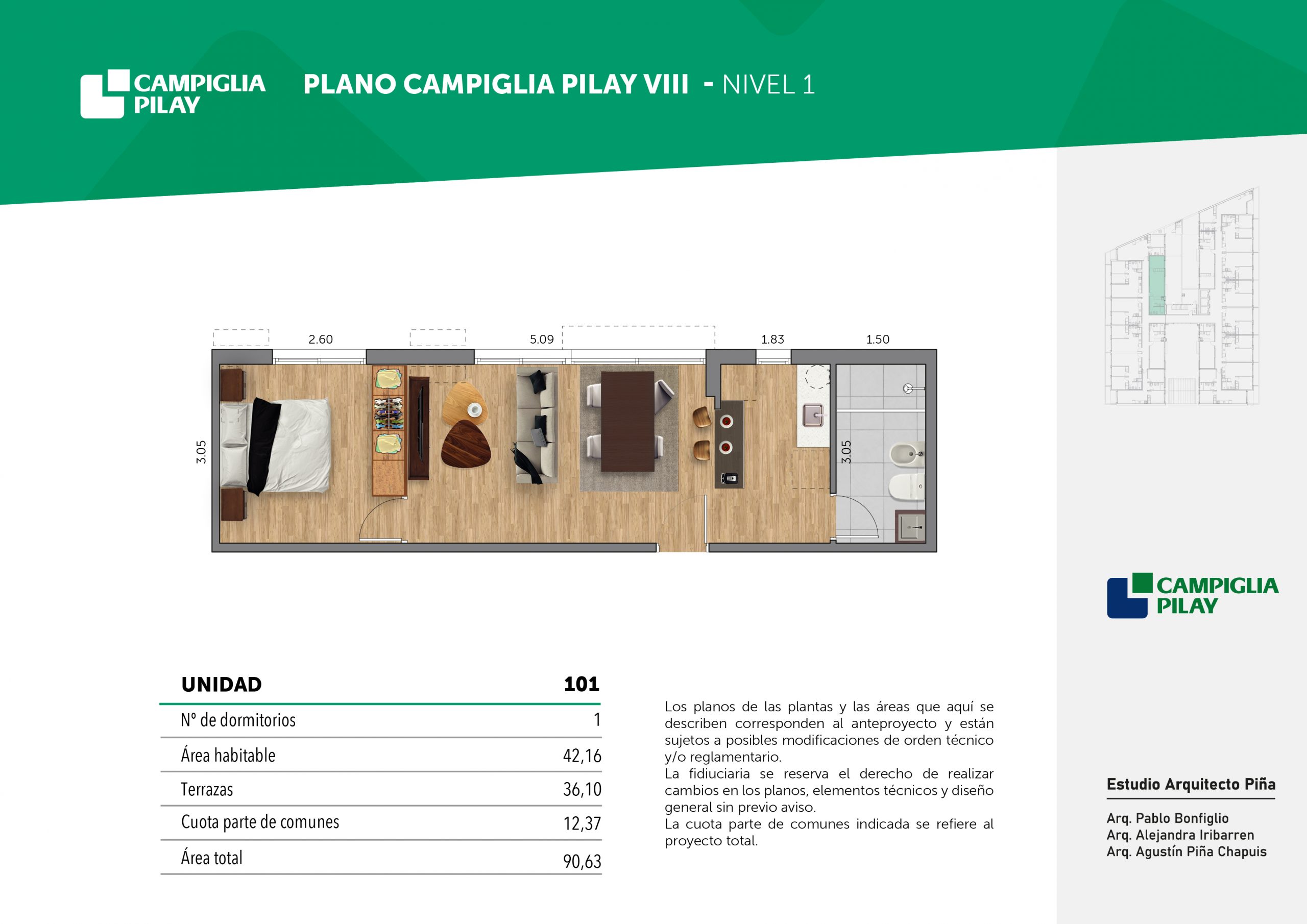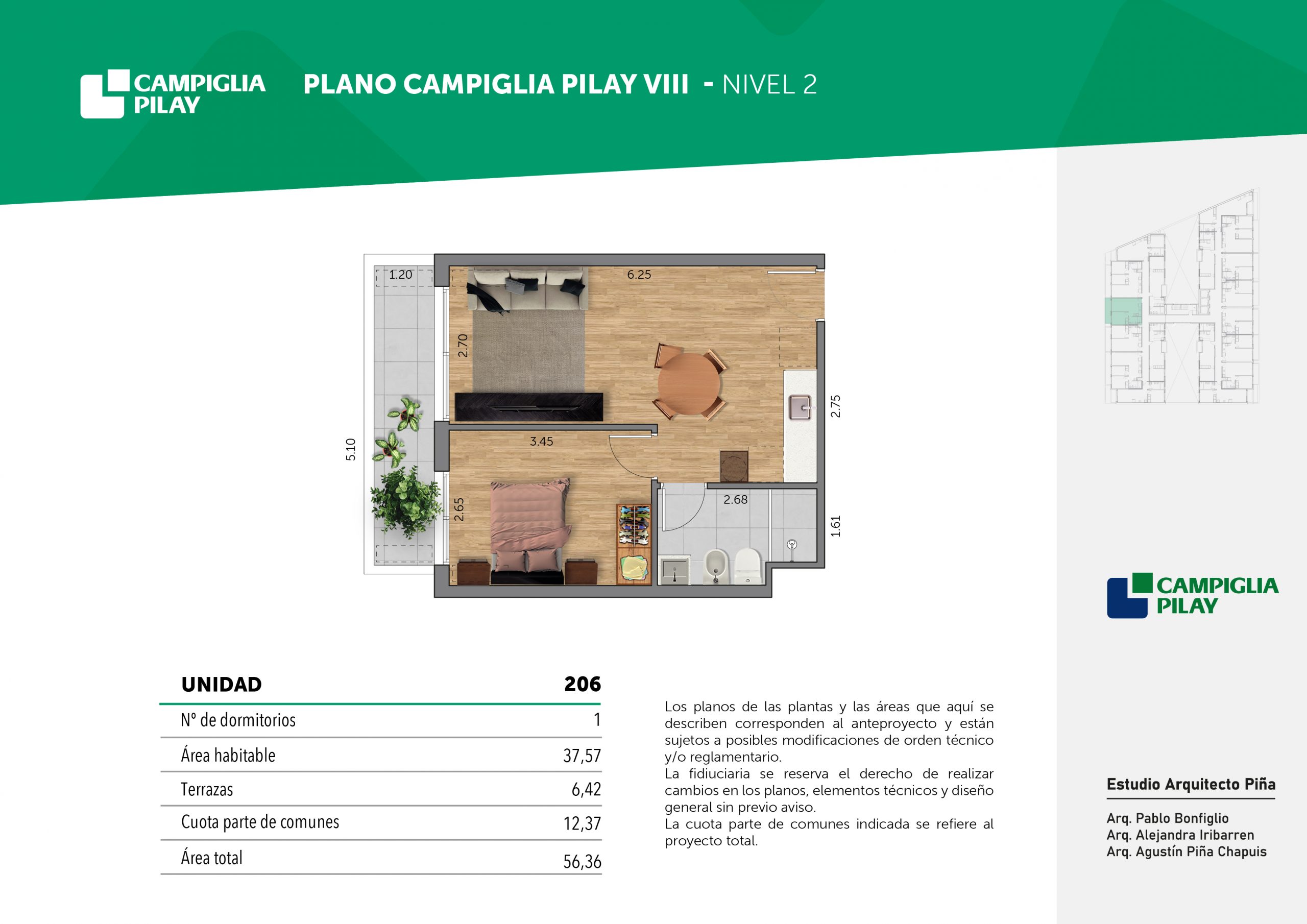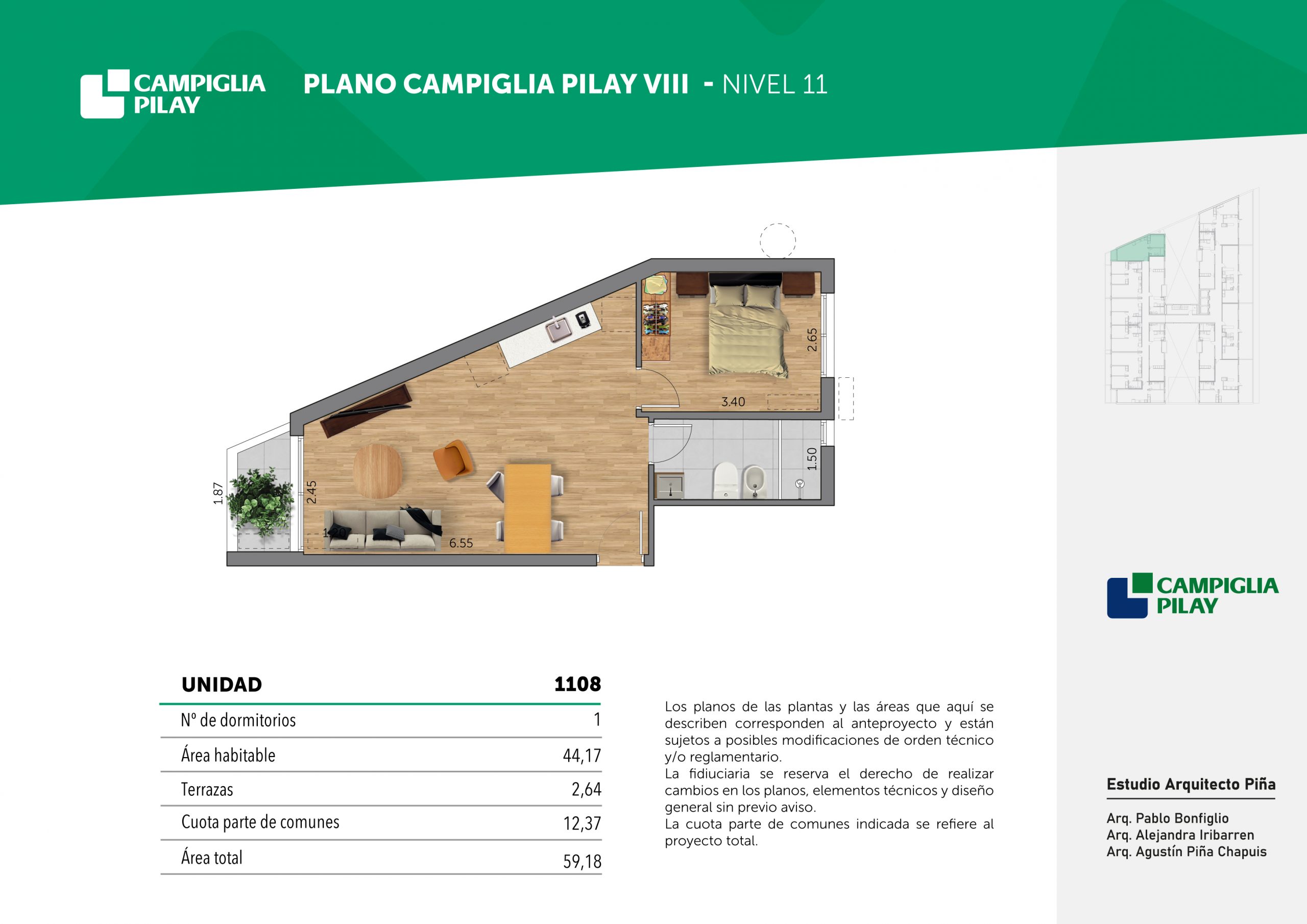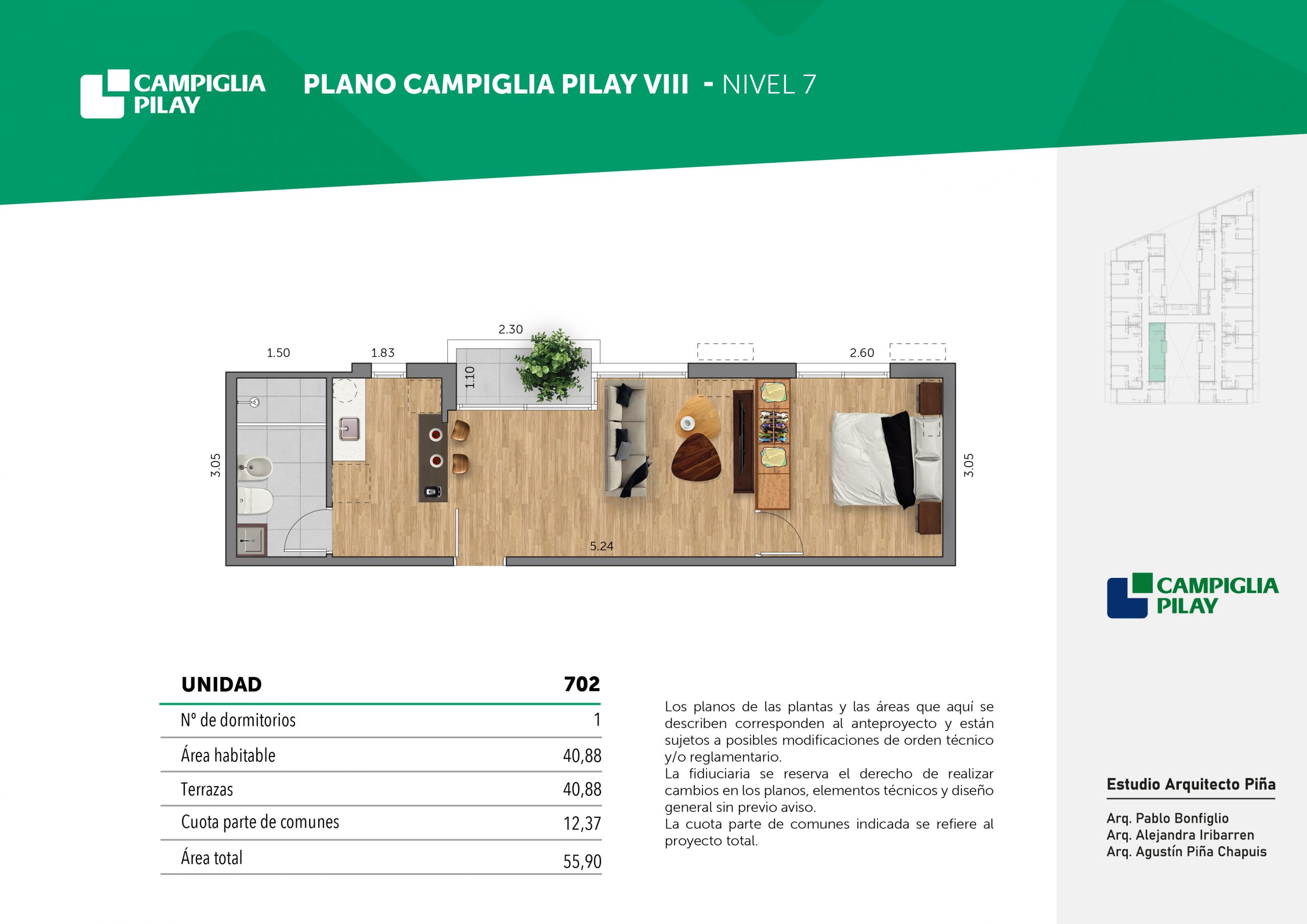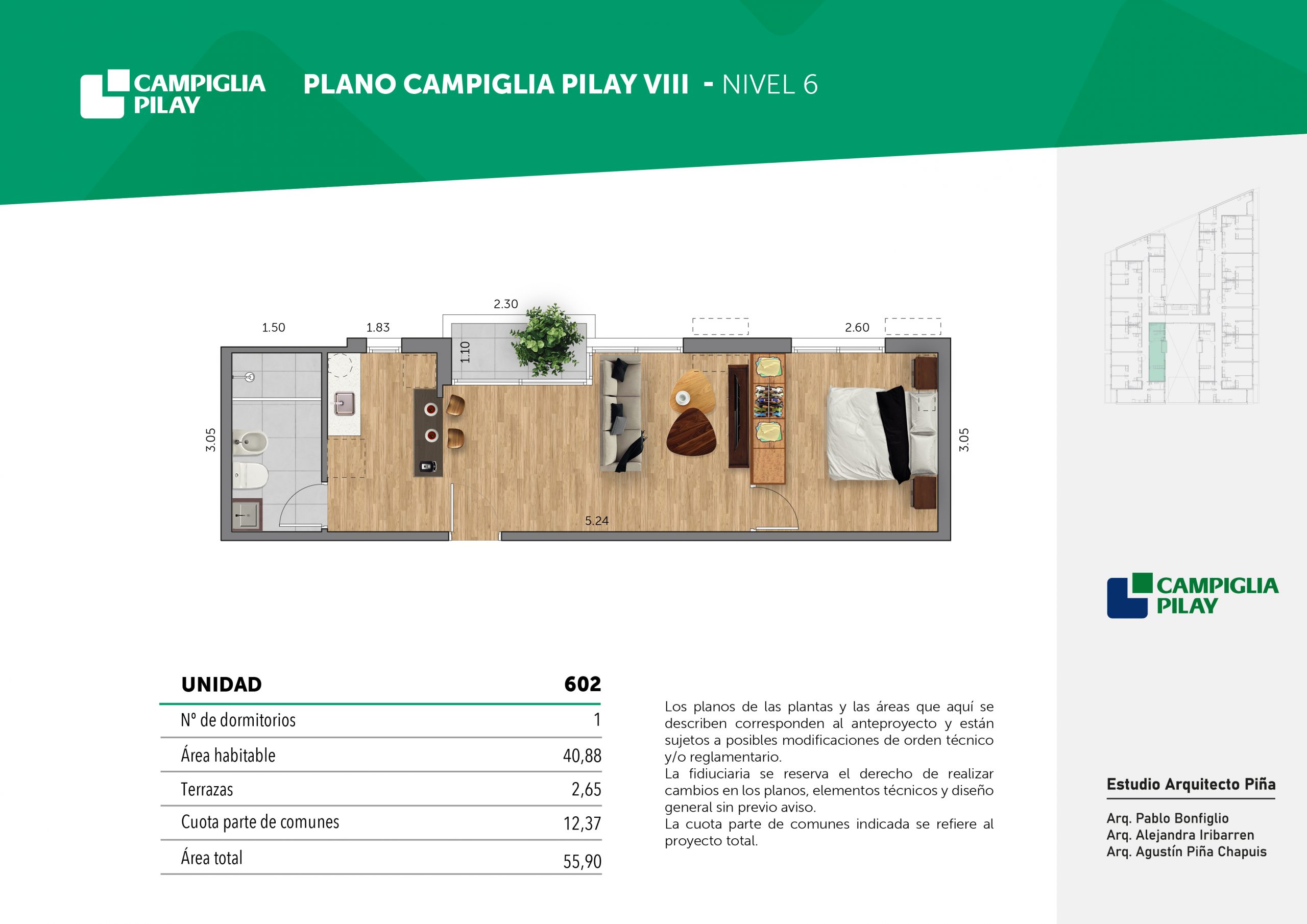 Cantidad de unidades en total: 195 unidades (159 unidades de 1 dormitorio y 46 unidades de 34 dormitorios) + 118 cocheras en total (aprox).