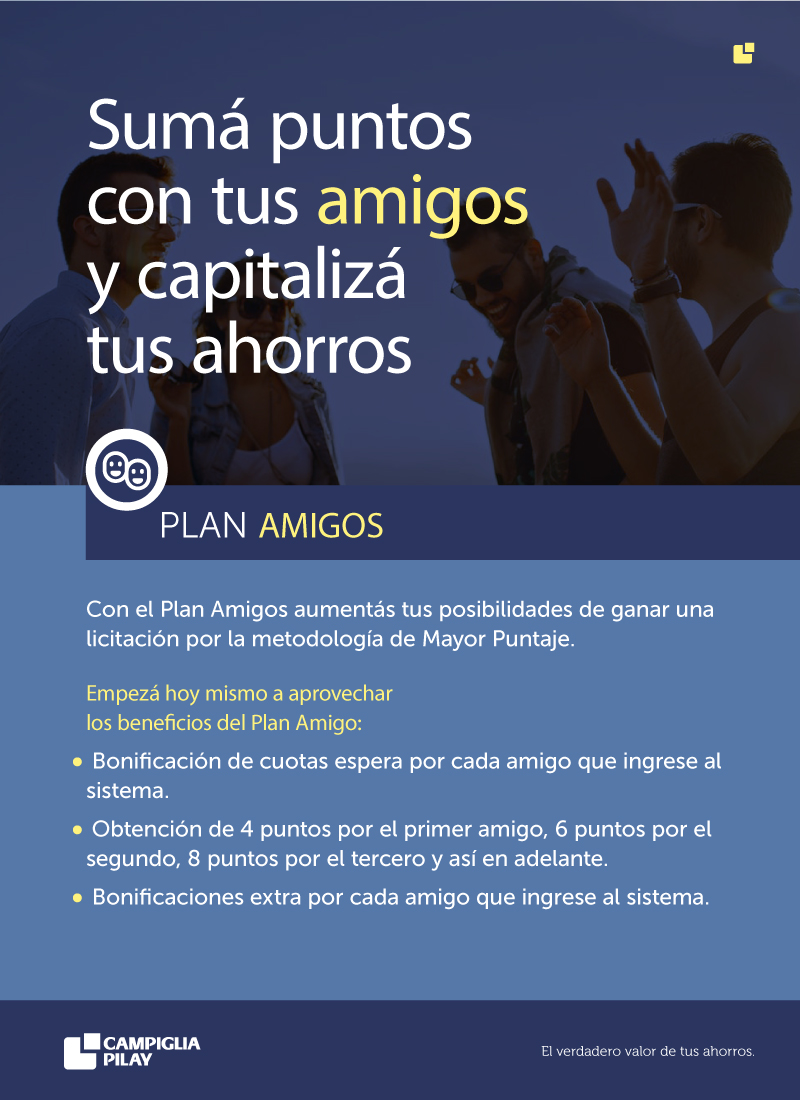 Es una herramienta que te ayuda a incrementar tu ahorro para acercarte a tus objetivos brindándote dos importantes beneficios. Por un lado, te bonifica cuotas espera por cada amigo que ingresa al sistema y por otro, aumenta sustancialmente las posibilidades de ganar una licitación por la metodología de Mayor Puntaje.